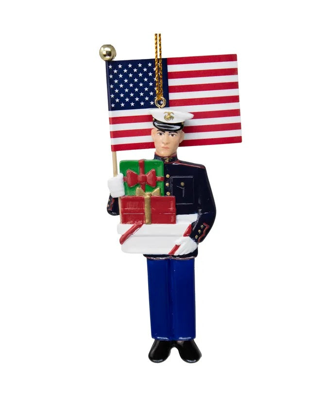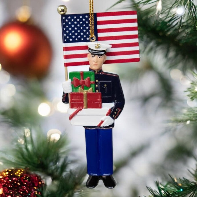 This Marine Corps® Dress Blues Ornament is a finely crafted symbol of tradition, honor, and the distinguished service of the United States Marine Corps. This meticulously designed ornament pays homage to the iconic Dress Blues uniform, showcasing the timeless elegance and precision that embodies the Marine Corps' commitment to excellence. Crafted with attention to detail, the ornament features a miniature representation of the Dress Blues uniform, complete with the distinctive white belt, scarlet blood stripe, and polished brass buttons.