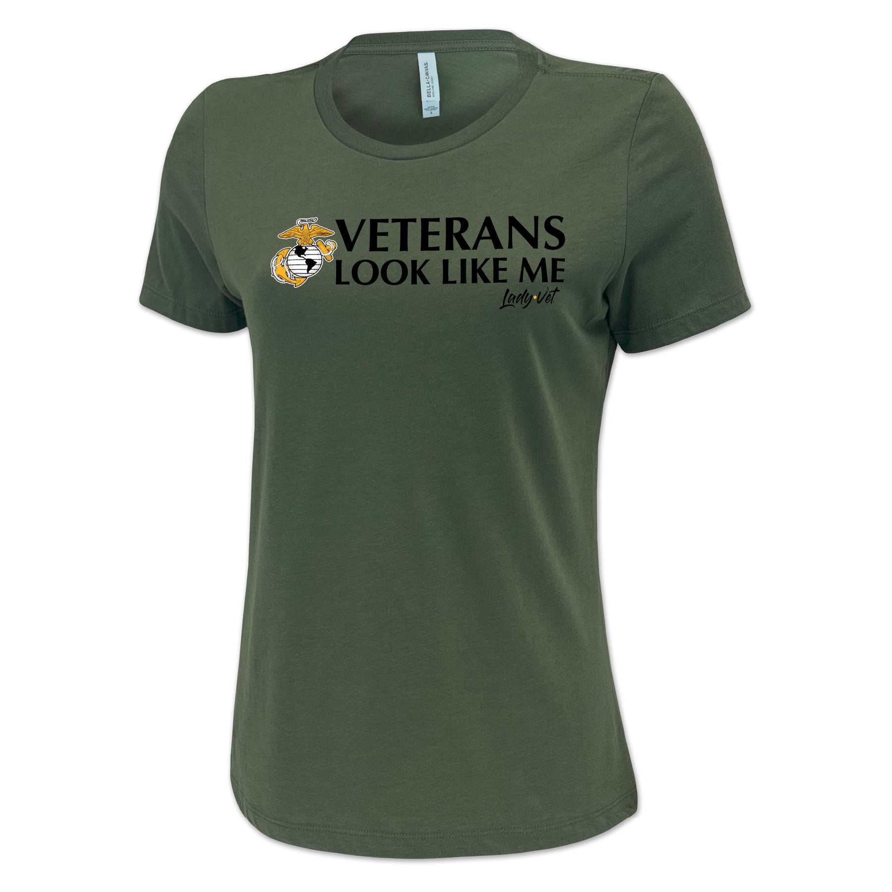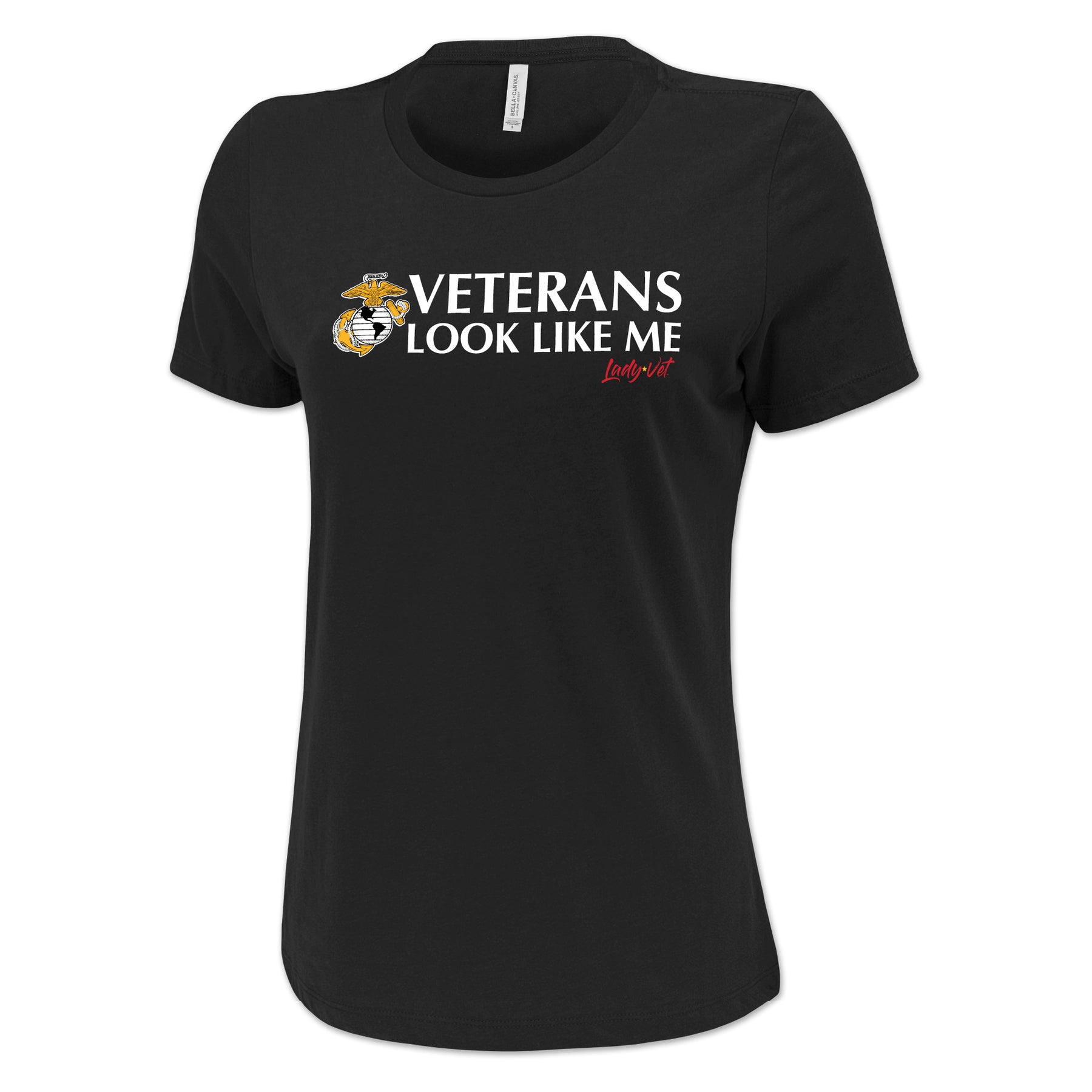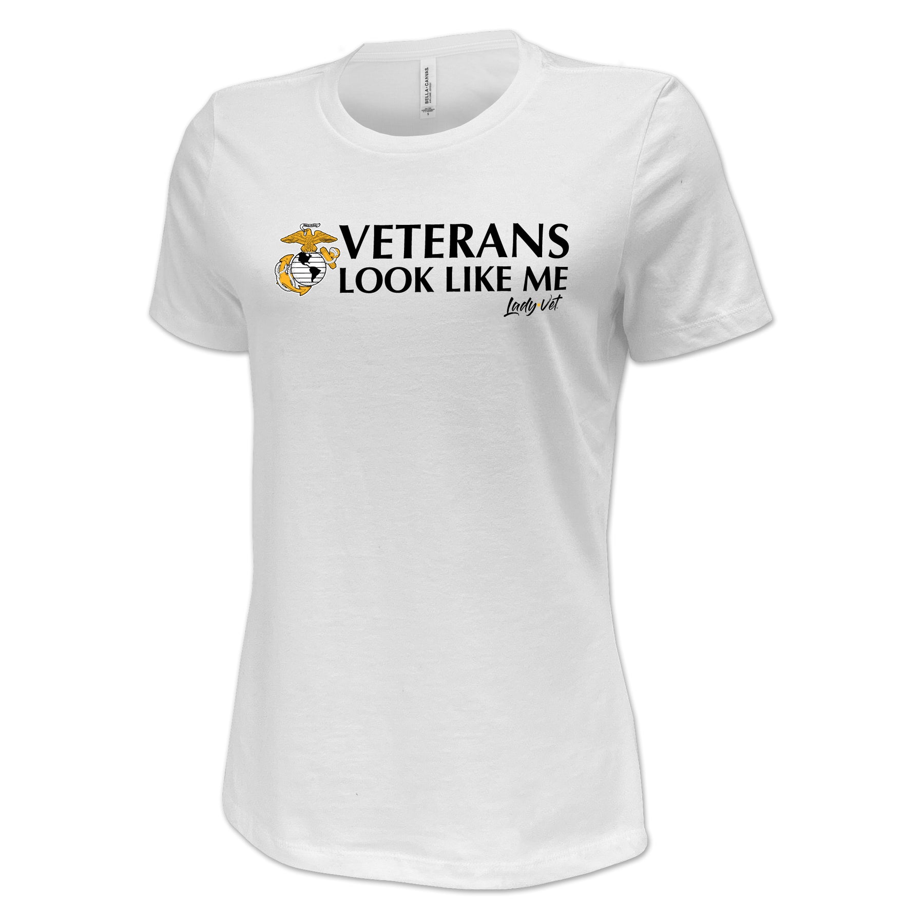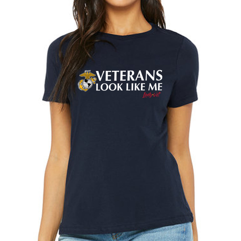 Lady Vet is a woman-owned, Veteran-owned brand created specifically to challenge public assumption of what a Veteran looks like. Show your support or wear it proudly; the Marines Vet Looks Like Me Ladies T-Shirt!