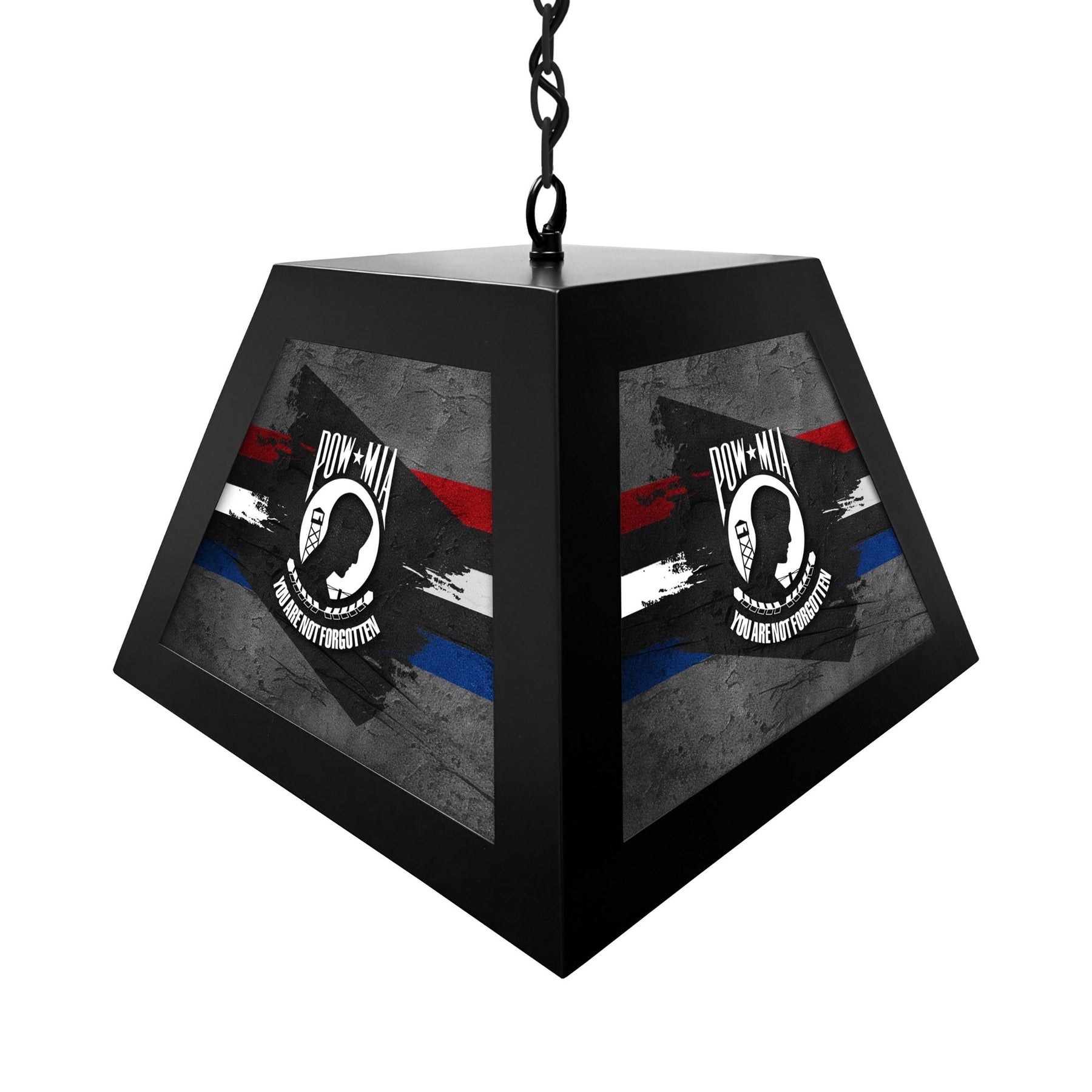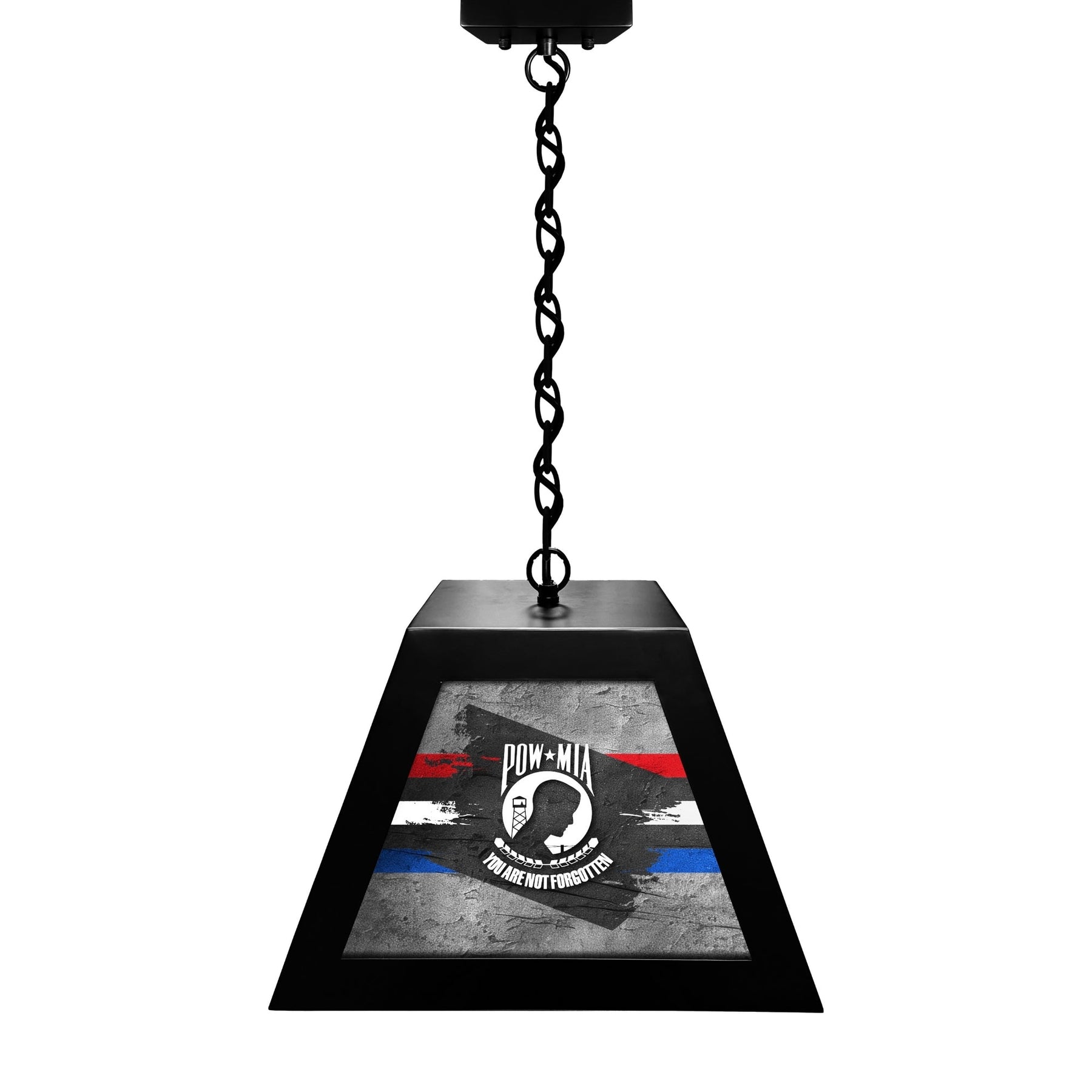The POW/MIA Box Pendant Light is a stylish and durable lighting fixture, designed to add a bold touch to your billiard tables, game rooms, or bars. Featuring a sleek metal frame with vibrant, backlit graphics, this light creates a dynamic ambiance. Whether used for a nostalgic reminder or to accent any living or work space, this light makes a great statement!