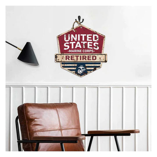 Show off your American spirit by celebrating our Retired Marine Corps with this unique hanging badge sign. Each piece is digitally printed on MDF, with the look of rusted tin. Add a finishing touch of pride to let everyone see your true spirit in honoring our heroes!