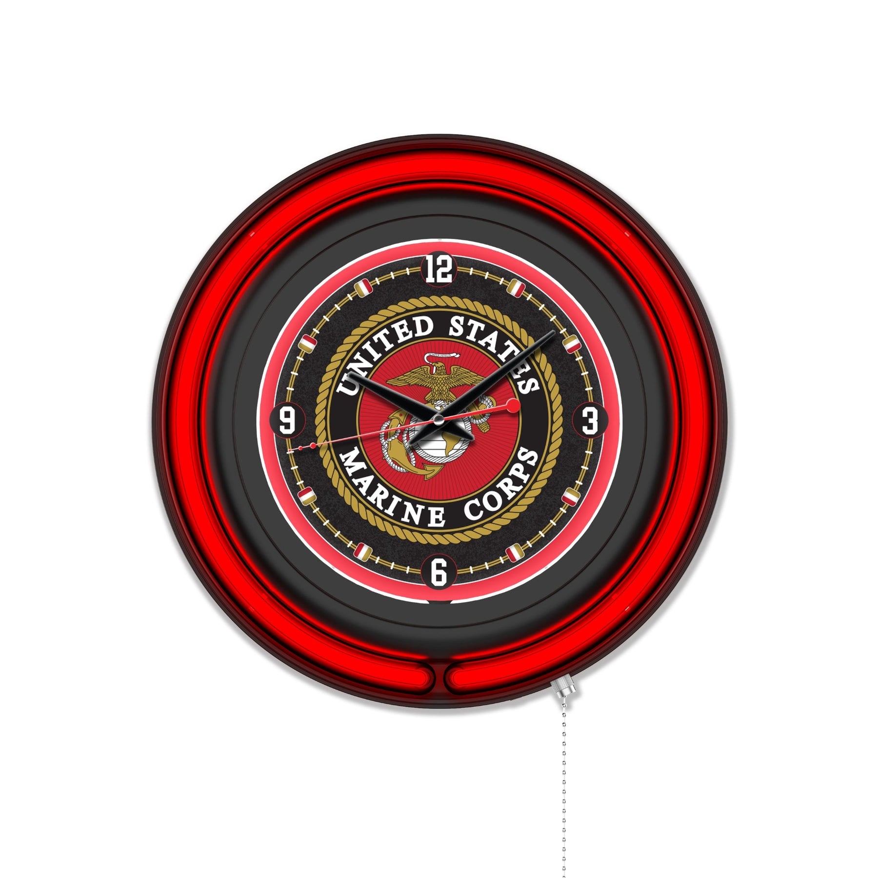 The United States Marine Corps Double Neon Wall Clock is the perfect way to show your support for our troops. Featuring a chrome casing and a color specific neon outer ring that accents the custom printed clock face which is lit up by an brilliant white, inner neon ring. The Neon rings are easily turned on and off with a pull chain on the bottom of the clock, and are powered by a UL Listed power transformer that runs off standard 120V outlet. Accurate quartz movement ensures proper time and is powered by a single, AA battery (not included).Add a bold and vibrant touch to your décor while proudly displaying your support for the United States Marines!