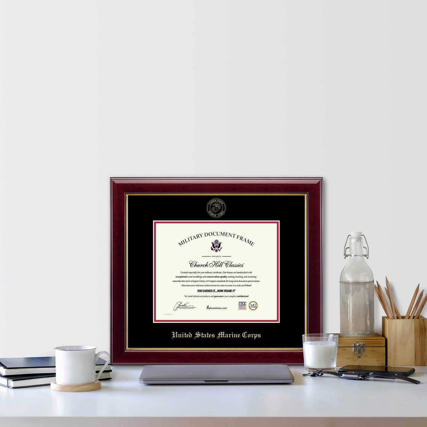 Features the United States Marine Corps name and official seal gold embossed on black and gold museum-quality matting. Framed in gallery molding crafted of solid hardwood with a high-gloss cherry transverse grain and a gold lip, this certificate holder is sure to beautifully show off your certificates!