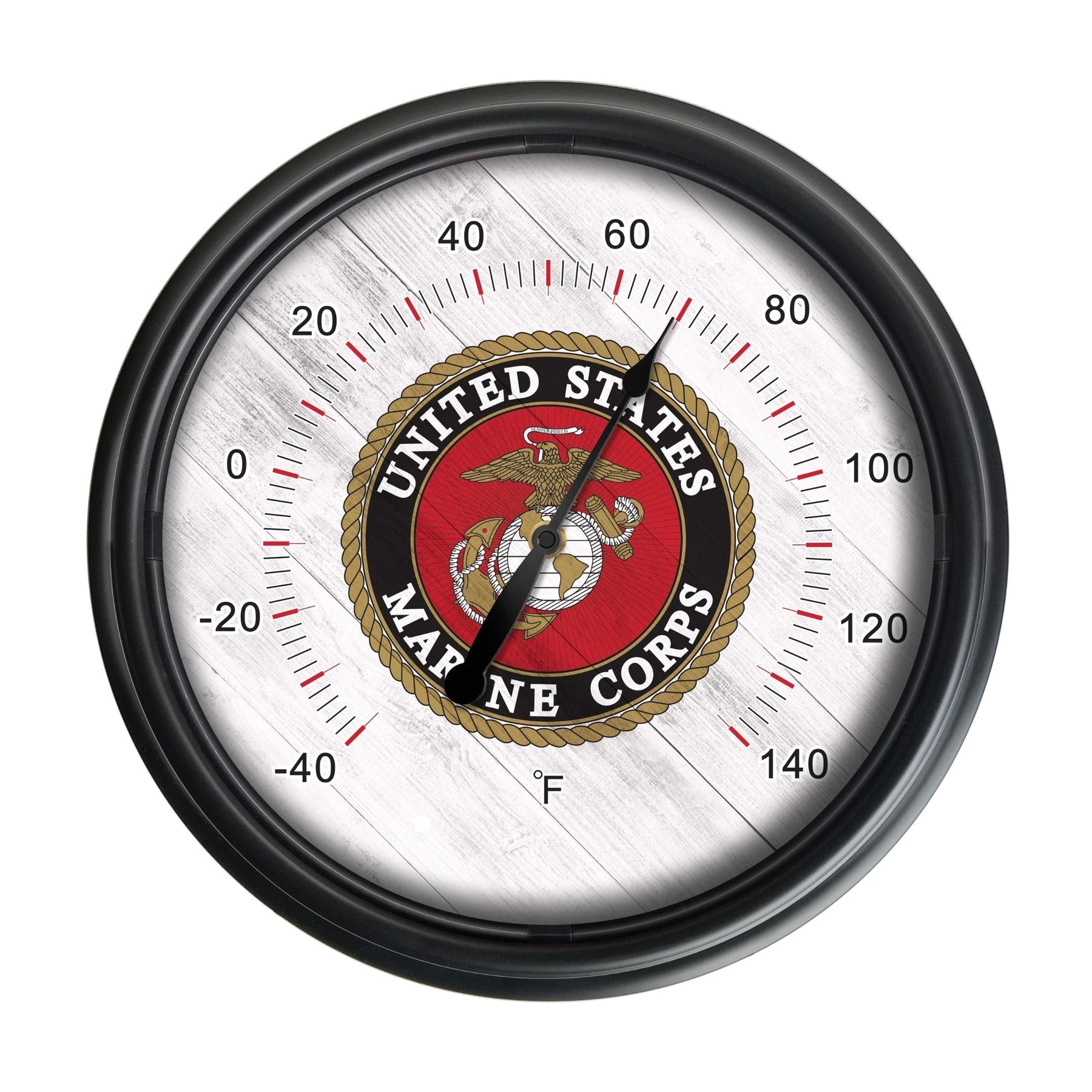 The dynamic United States Marine Corps Indoor/Outdoor LED Thermometer showcases vibrant, full-color UV printed artwork that is both eye-catching and durable. Factory calibrated to provide precise temperature readings from -40 degrees Fahrenheit to 140 degrees Fahrenheit, it's a reliable weather gauge for any setting. Show your pride in the United States Marines with this functional and decorative thermometer!