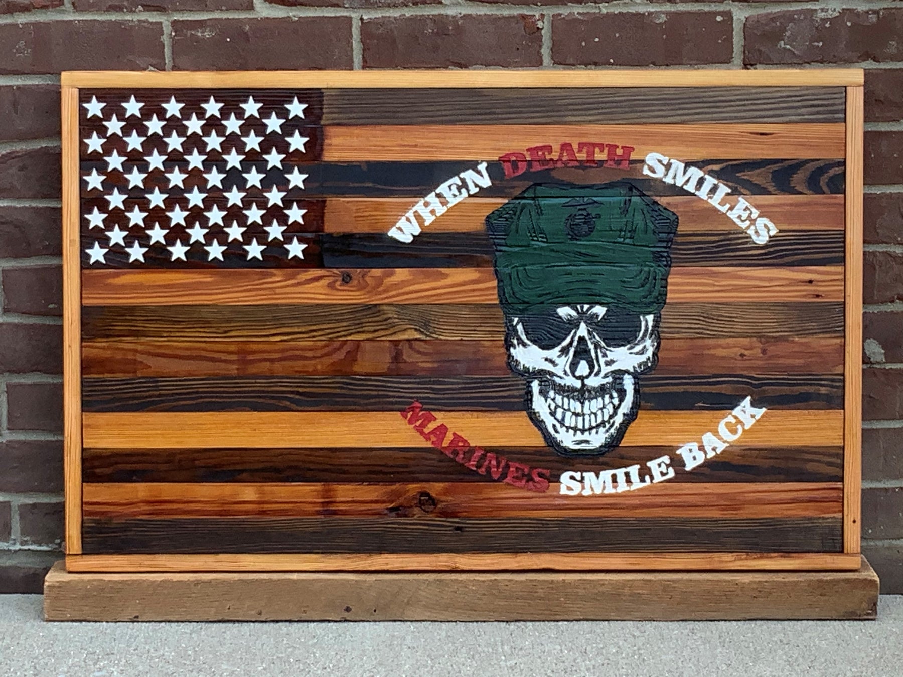 This When Death Smiles Barnwood Flag is an impressive way to show off your patriotism. Made to order with reclaimed barnwood, it's hand engraved and hand painted for a unique, rustic look. An ideal addition to any home or office.